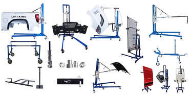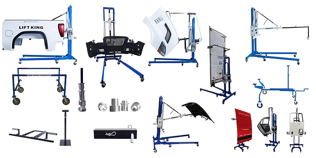 The Lift King Combo Works Package comes with everything needed to remove or install pickup boxes, hitches, hoods, semi hoods, fifth wheels, bumpers of all sizes, doors on passenger vehicles, sprinter vans, semi trucks, and semitrailers.